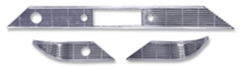New 3-piece dash trim set. Has all the factory cutouts and holes. Made from polished anodized aluminum with black silk screened line details. Made in USA. Dont forget #158 dash script to finish this off.