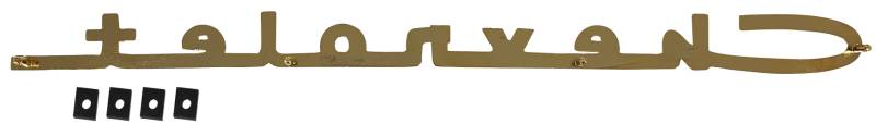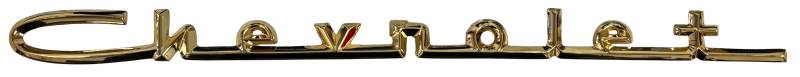New reproduction gold Chevrolet script. Comes with mounting clips. Used on 1957 Belair cars on the hood or trunk when a factory V8 car. This is a 13 inch script.